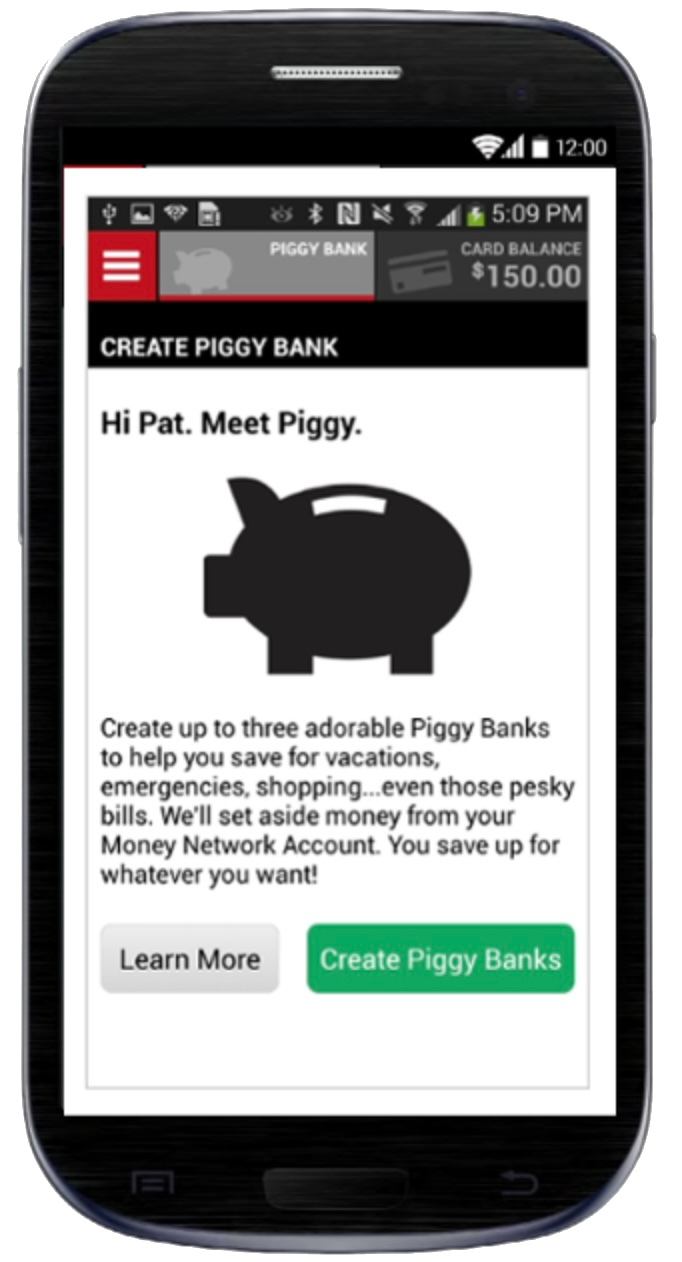 Strategy, design and content for widely-used feature; digital Piggy Banks for setting and saving for goals. Note that I also came up with the name and wrote the in-app copy for this feature.