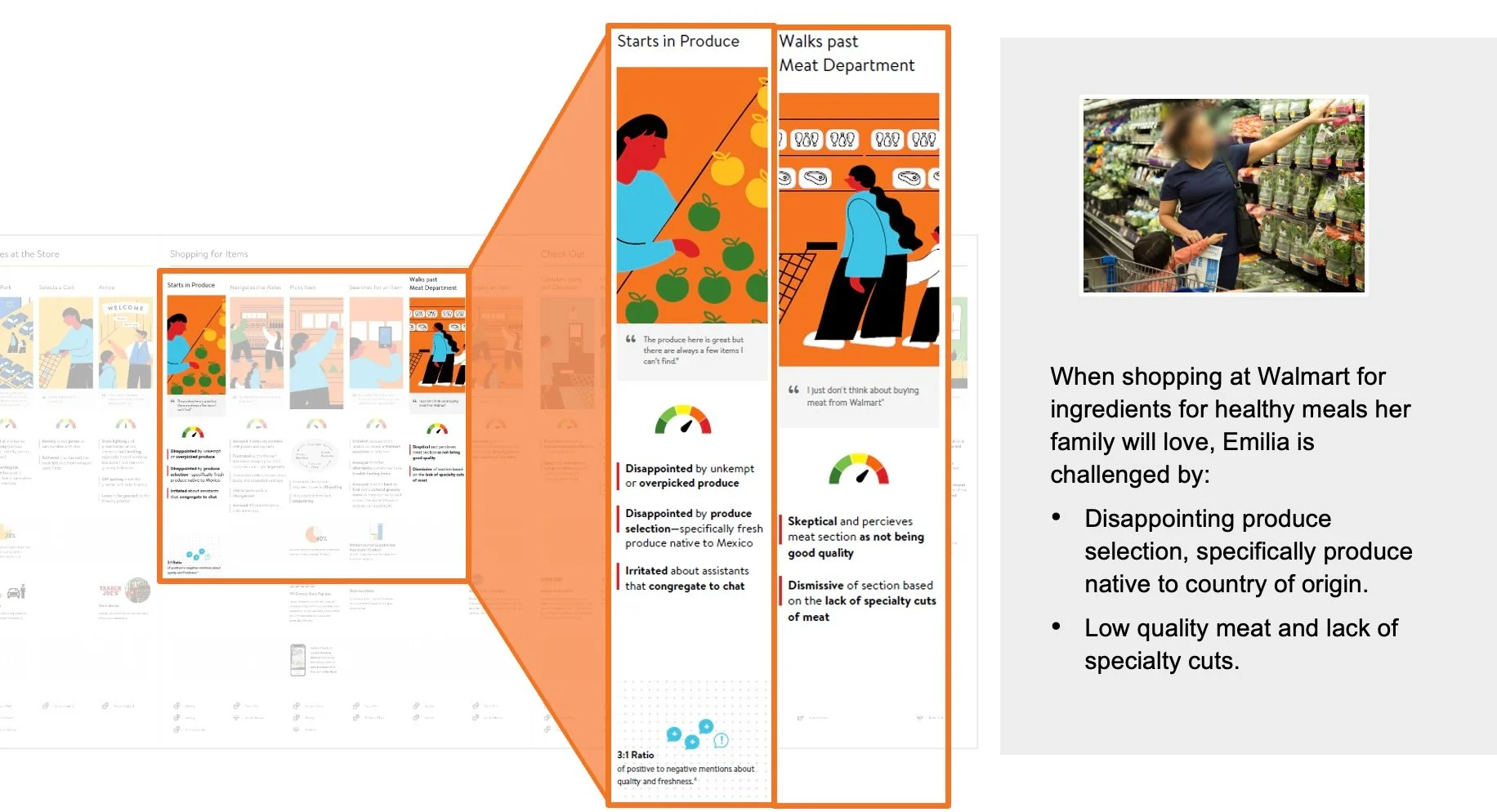 Six Customer Journey maps identifying needs, pain points, delighters, and opportunities for Walmart